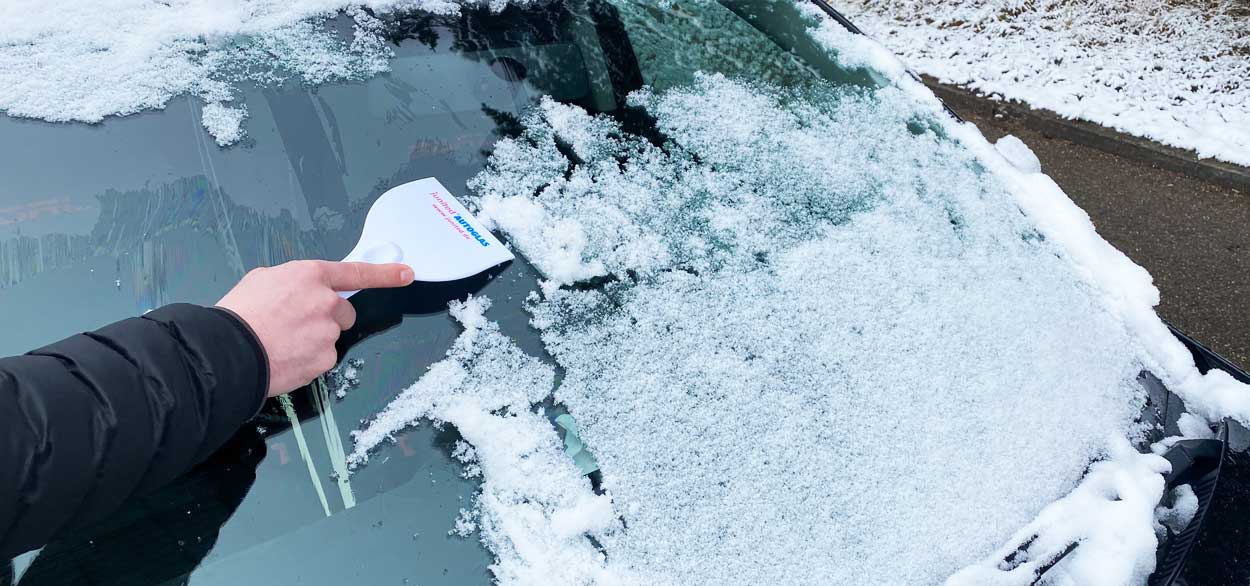 Zum Entfernen von Eis auf der Scheibe ist ein Eiskratzer aus Kunststoff mit Griff die erste Wahl. Um die Scheiben eisfrei zu machen, kommen Sie am besten voran, wenn Sie den Eiskratzer in flachem Winkel ansetzen, dann – mit leichtem Druck – von oben nach unten, vom Rand rechts und links zur Scheibenmitte arbeiten (wie im Bild dargestellt). Auch Enteisungsspray wirkt schnell und unterstützend, zumindest bei einer dünneren Eisschicht.